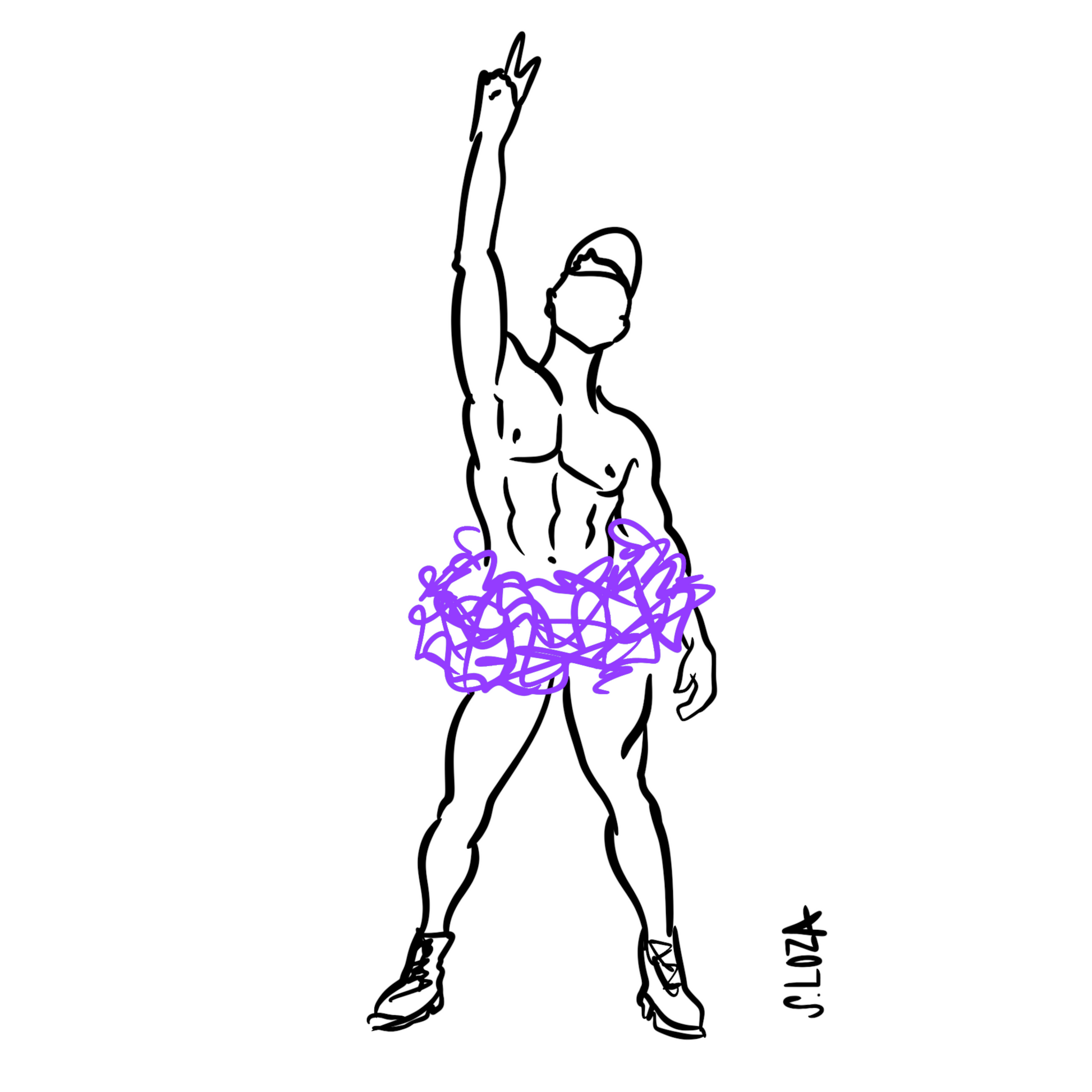 Original Painting: Measuring an impressive 18x24 inches, the original painting commands attention with its bold, clean lines and modern aesthetic. Designed to fit seamlessly into contemporary environments, Loza's masterpiece is sure to become a conversation starter and a focal point of your decor. The clear acrylic glass canvas with predominately black paint strokes is striking on its own, while a pop of vibrant purple in the form of a tutu worn by the central male figure adds a burst of color and depth to the piece.